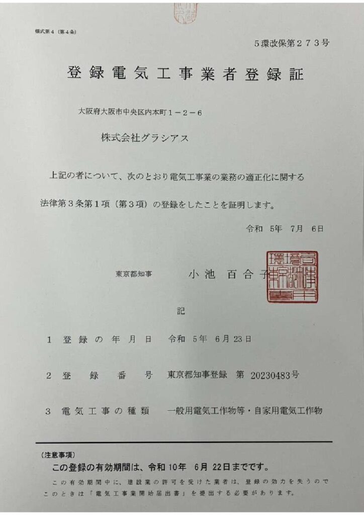 当社は、令和5年6月23日付けで、電気工事業登録を行いました。